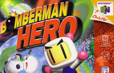 Bomberman Hero controls very differently from Bomberman 64. In Hero the character can jump, has more lives, faces tougher bosses, and has the ability to throw bombs farther. There are several different areas to be encountered, each with about five different stages. A unique feature is that it's possible to play with an extra advancement, such as a jet pack or a submarine. There are also several different types of bombs in addition to the regular ones. Ice bombs turn enemies into a block of ice which can be moved around and used to jump on to get to higher places. Salt bombs only harm slugs, which cannot be harmed by any other means. Control bombs explode when remotely detonated; a useful ability against certain bosses. Much of the game's replay value is in the sub-mission of scoring the amount of target points per stage, which awards Bomberman a certain amount of stage points (1 through 5) at the end of each level. You can re-enter the stages as often as you like, in order to secure the highest possible score within the stage. Medals are awarded on a per-planet basis, awarded based on the total number of stage points at the planet's completion (red, blue, bronze, silver, and gold).